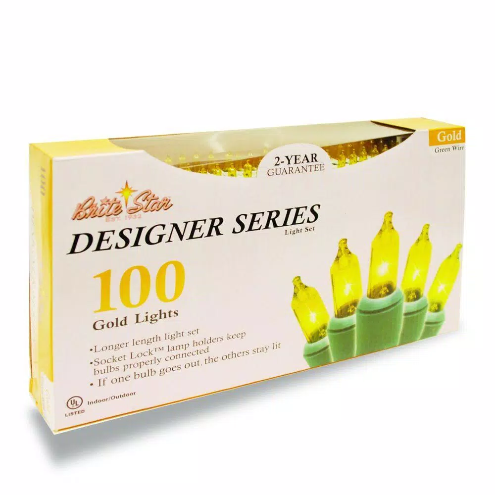 Each strand has 100 incandescent mini-bulbs on green wire to blend in with your Christmas tree or landscaping. 36.75 ft. strand includes 18 in. lead cord, 4.25 in. spacing between bulbs and 3.5 in. end cord. Each string has end-to-end connector for adding on light sets. Replacement bulbs and fuses included. Suitable for indoor and outdoor use, UL-listed, box of 2.