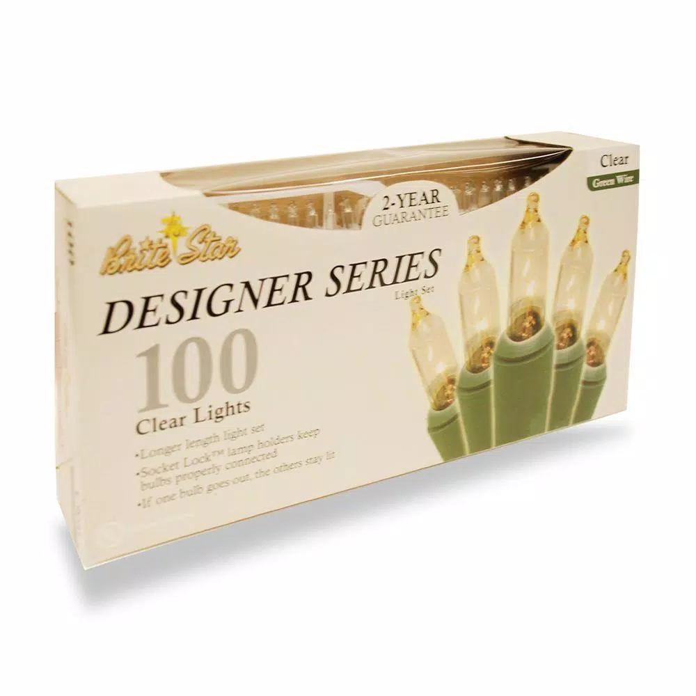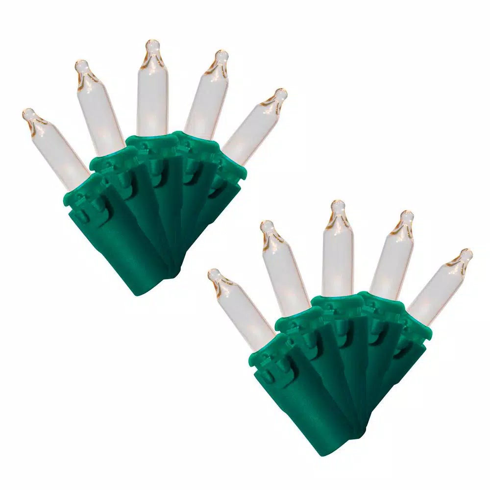 Each strand has 100 clear incandescent mini-bulbs on green wire to blend in with your Christmas tree or landscaping. 36.85 ft. strand includes 18 in. lead cord, 4.25 in. spacing between bulbs and 3.5 in. end cord. Each string has end-to-end connector for adding on light sets. Replacement bulbs and fuses included. Suitable for indoor and outdoor use, UL-listed, box of 2.