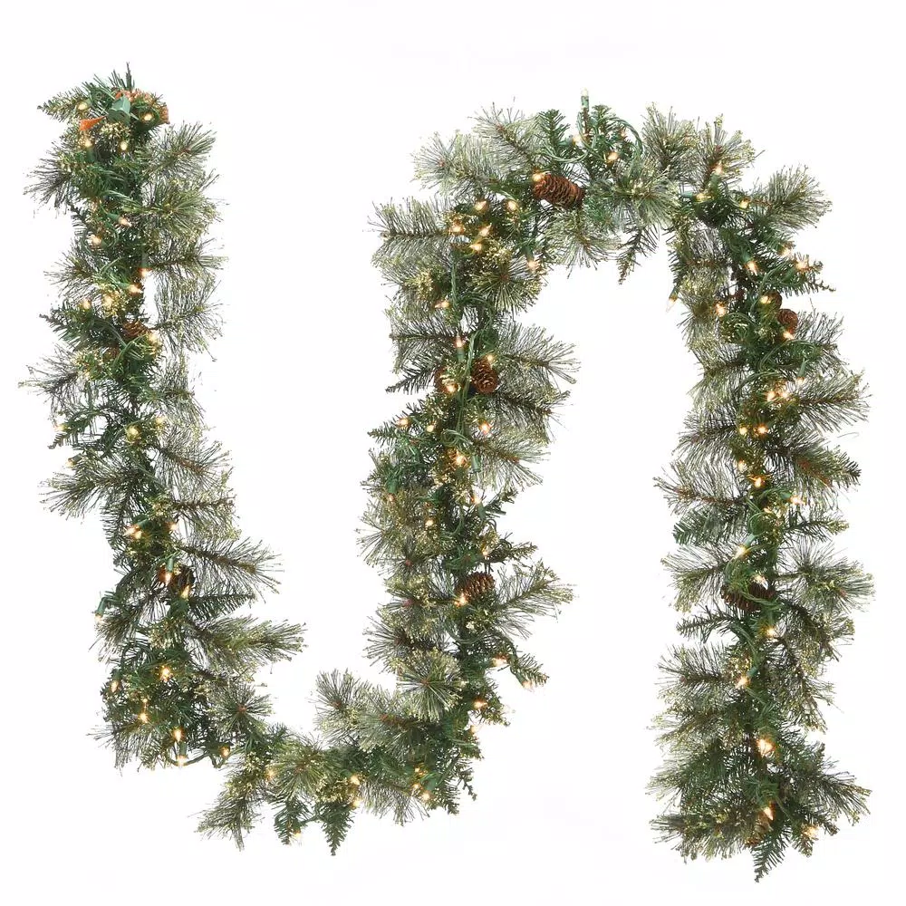 The Golden Bristle is a mixed branch garland featuring bristle tips for a softer look. This garland is trimmed with pine cones and dusted with gold glitter. It is pre-strung with 100 clear lights that remain lit even if a bulb burns out. This indoor/outdoor garland can be displayed over doors, windows, fireplace mantels, fence, or stairway railings.