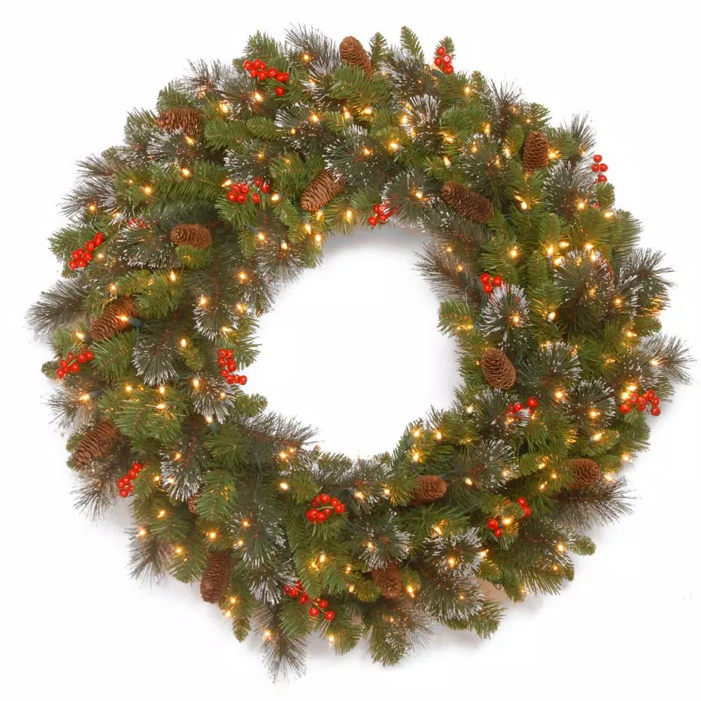The Crestwood Spruce is a sparkling mixed branch wreath featuring bristle tips and trimmed with pine cones, red berries and glitter. It is pre-strung with 200 clear lights that remain lit even if a bulb burns out. This wreath can be displayed on doors, walls and windows in indoor or covered outdoor locations.