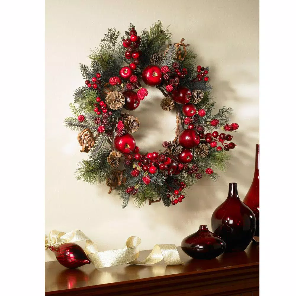 Savor the sweet ambiance of apples and berries with this vibrant, multi-colored wreath. Shades of crimson and wine envelop this gorgeous creation, surrounded by a blend of lush greenery. Each delicately crafted piece of fruit is so natural-looking; only you’ll know it isn’t to be picked and eaten. At twenty-two inches in diameter, its the perfect size to adorn your front door or displayed proudly on a dining room wall.