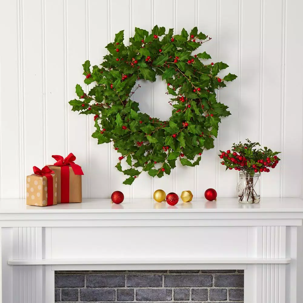 Ring out the seasonal cheer with this artificial wreath intricately designed from an overgrowth of realistic looking holly greenery, handsomely accented throughout with faux holly berries that look incredibly realistic. Perfect for wall and/or door display in either a home or office environment, this 28 in. (in circumference) decorative wreath makes for an inviting accent and can undoubtedly help inject front-door appeal all throughout the holiday season. Silk plants are manufactured using synthetic materials, such as polyester material or plastic, and are well designed and constructed to be life-like in appearance. This item will need to be re-shaped when removed from the secure box to allow it to reach its fullest size. Your artificial plant will look beautiful for years to come; simply wipe clean with a soft dry cloth when needed. About Nearly Natural Inc. – For over 75-years, Nearly Natural Inc. has been providing conscientious consumers with beautiful alternatives to natural decorations. Employing and advised by naturalists who understand the live plant world, Nearly Natural is able to recreate the most realistic-looking decorative items for homes, offices, and businesses. Driven by a true commitment to customer service, attention to detail, and natural philosophy, Nearly Natural strives to bring customers the most beautiful, unique, and striking faux plants and floral on the market.