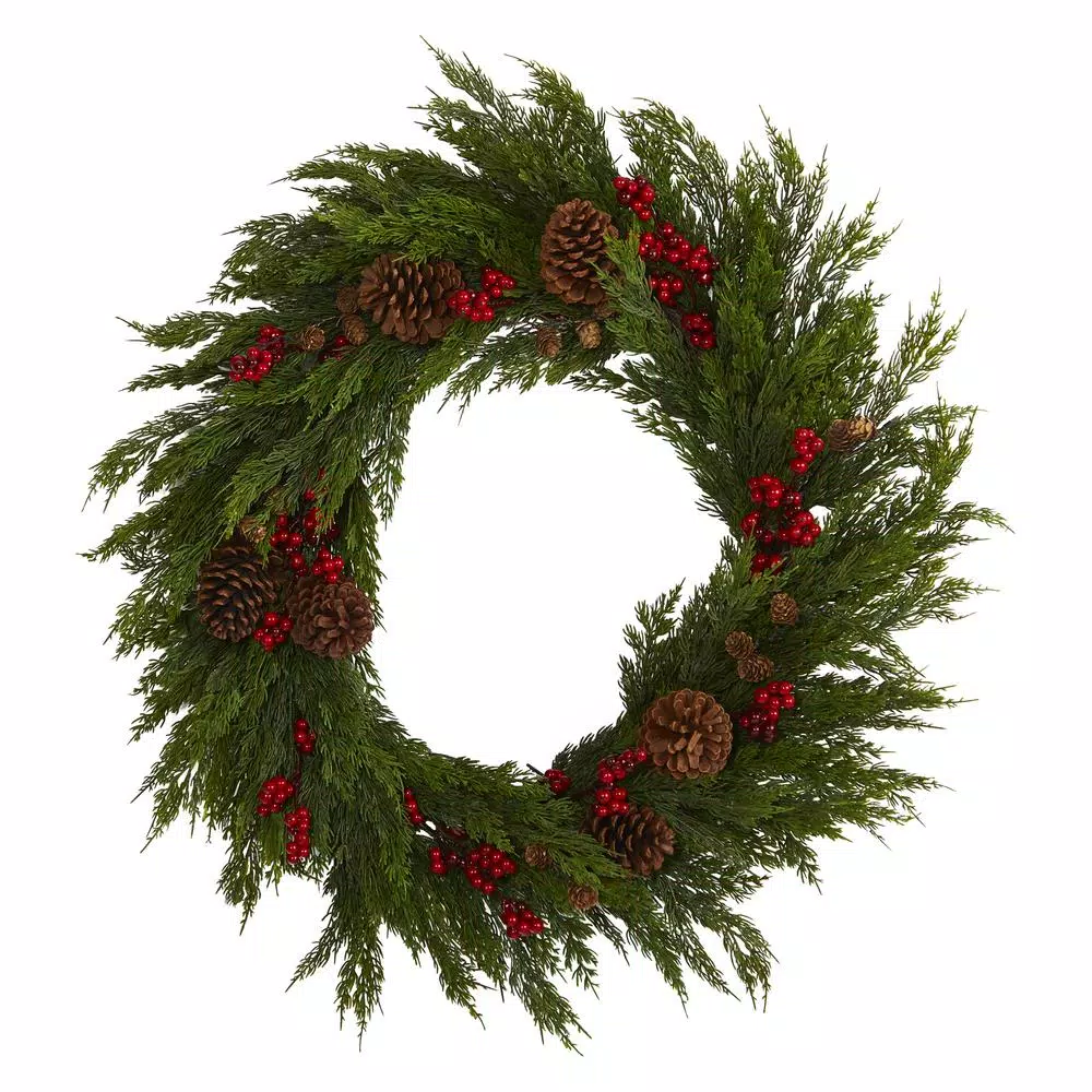 Update your traditional decor accents and add some curb appeal to your home or office entrance with the beauty provided by this artificial wreath intricately designed from realistic looking cypress evergreens, carefully accented throughout with sprays of bright red holly berries and faux pinecones, all of which looks incredibly realistic. Perfect for wall and/or door display in either a home or office environment, this traditional 32 in. (in circumference) decorative wreath makes for an inviting accent and can undoubtedly help inject front-door appeal all throughout the holiday season. Silk plants are manufactured using synthetic materials, such as polyester material or plastic, and are well designed and constructed to be life-like in appearance. This item will need to be re-shaped when removed from the secure box to allow it to reach its fullest size. Your artificial plant will look beautiful for years to come; simply wipe clean with a soft dry cloth when needed.