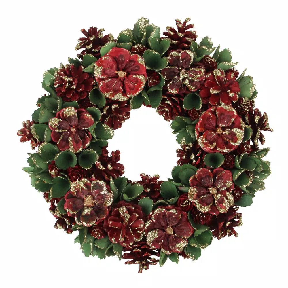 Add a unique touch to your holiday season with this festive floral and pinecone wreath from the Urban Nature collection. Embellished with gold glitter it will also add some sparkle to your decor. It will be a perfect addition to your Christmas centerpiece doors and mantles. Product Features: Unlit. Assorted sized flowers leaves and pinecone wreath. Red and green with gold glitter. Jute rope for hanging. Circular foam backing. For indoor or covered outdoor display. No assembly required. wreath comes in 1-piece. Dimensions: 13.5 in. Dia (measured from outermost tip/edge to outermost tip/edge across the wreath). Material(s): wood/glitter/foam.