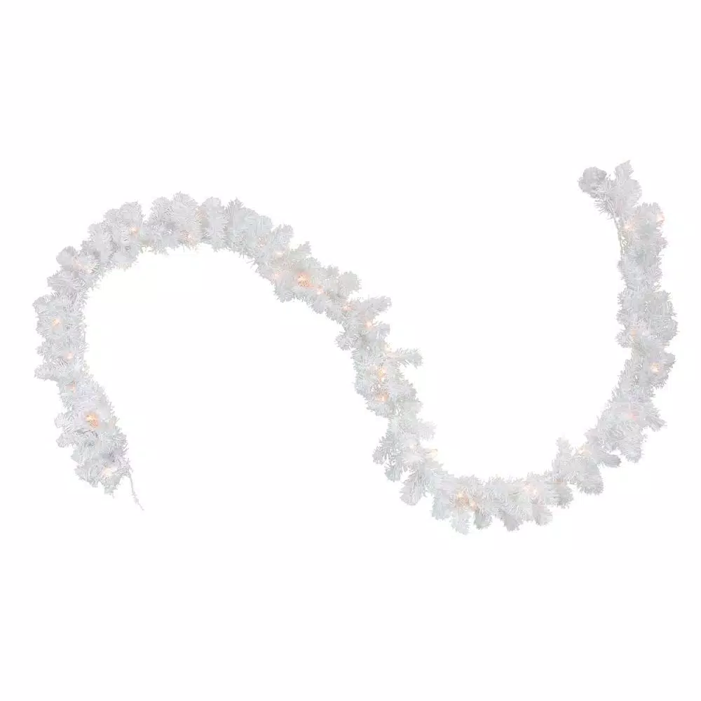 Deck the halls with boughs of garland. With warm white lights this garland is sure to cast a dazzling glow over your holiday decor. A perfect accent for a door or wall to add a bit of dimension and holiday cheer. Add ornaments or bows to make a unique decoration. Product Features: Snowy white branch tips. Pre-lit with 50 clear mini lights. 160 tips. 1.75 in. W tapered tips. 30 in. white lead cord. Additional Product Features: Super bright bulbs. Recommended for indoor use only. If 1-bulb burns out the rest will stay lit. Bendable wire center allows for you to shape the garland any way you desire. Metal hooks on each end for easy hanging. Flame retardant. UL listed for indoor or outdoor use. Contains end-to-end connectors allows you to connect multiple garlands together (not to exceed 210-Watt). Comes with replacement bulbs and spare fuse. Wire gauge: 22. 120-Volt 60 hz 0.17 Amp 20.4-Watt. Dimensions: 9 ft. L x 8 in. W. Material(s): PVC/glass bulbs/wire/metal.