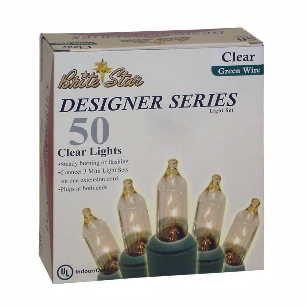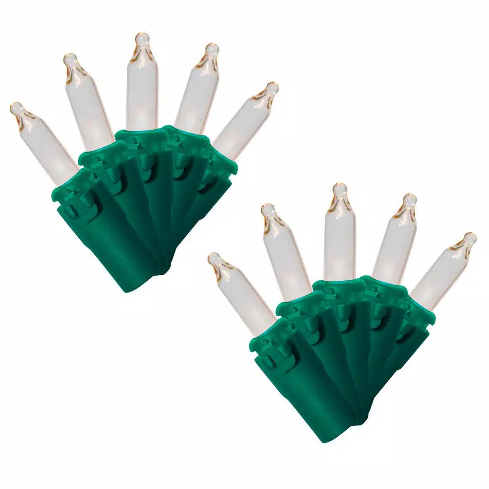 Each strand has 50 clear incandescent mini-bulbs on green wire to blend in with your Christmas tree or landscaping. 19.15 ft. total string length includes an 18 in. lead cord, 4.25 in. spacing between bulbs and a 3.5 in. end cord. Suitable for indoor and outdoor use, UL-listed, box of 2.