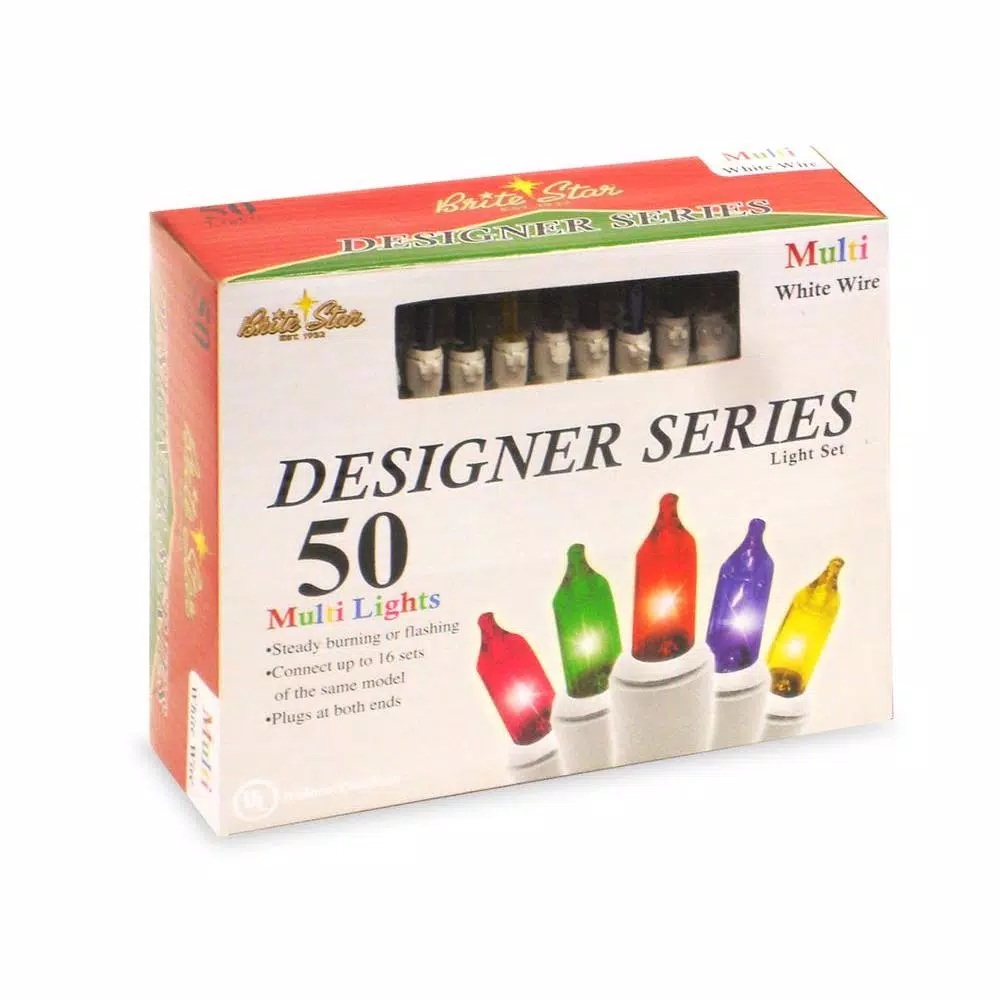 Each strand has 50 multi-color incandescent mini-bulbs in white casing for lighting up your Christmas tree or holiday decor. 19.15 ft. total string length includes an 18 in. lead cord, 4.25 spacing between bulbs and a 3.5 in. end cord. Suitable for indoor and outdoor use, UL-listed, box of 2.