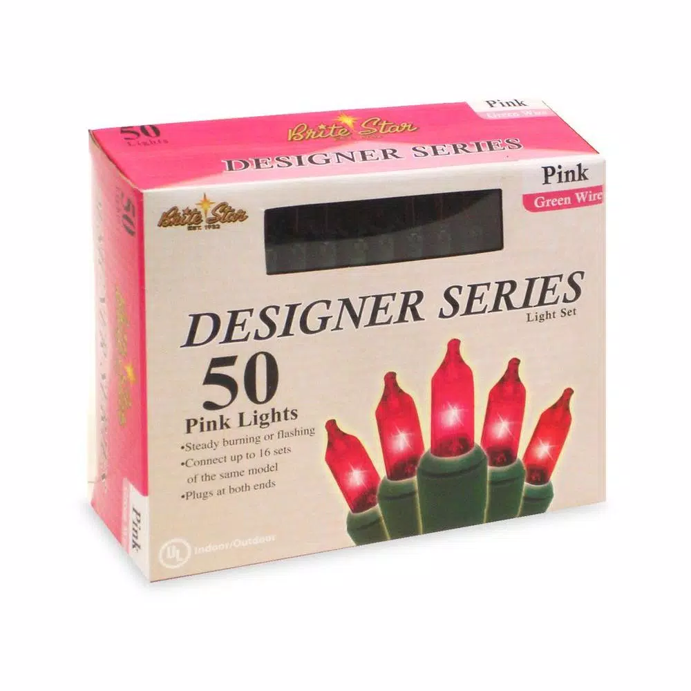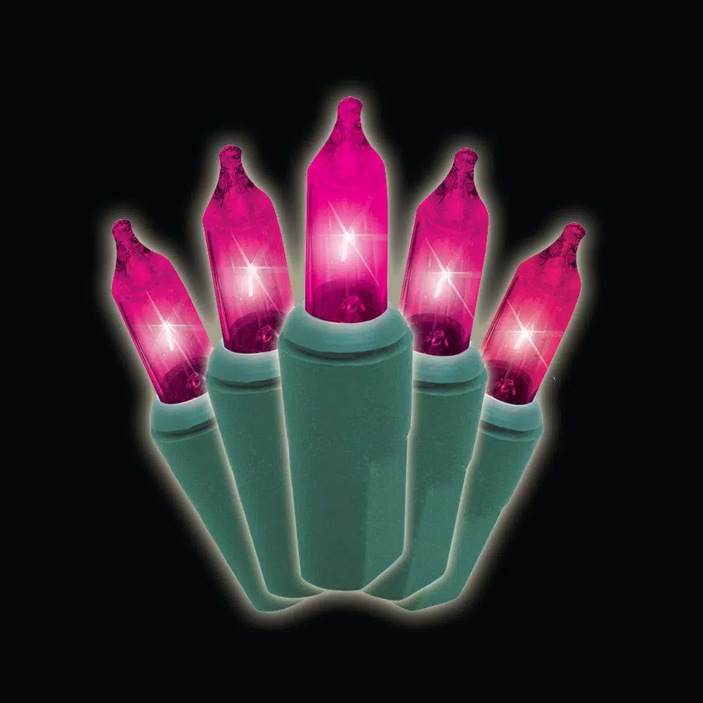 Each strand has 50 pink incandescent mini-bulbs on green wire to blend in with your Christmas tree or landscaping. 19.15 ft. total string length includes an 18 in. lead cord, 4.25 spacing between bulbs and a 3.5 in. end cord. Suitable for indoor and outdoor use, UL-listed, box of 2.
