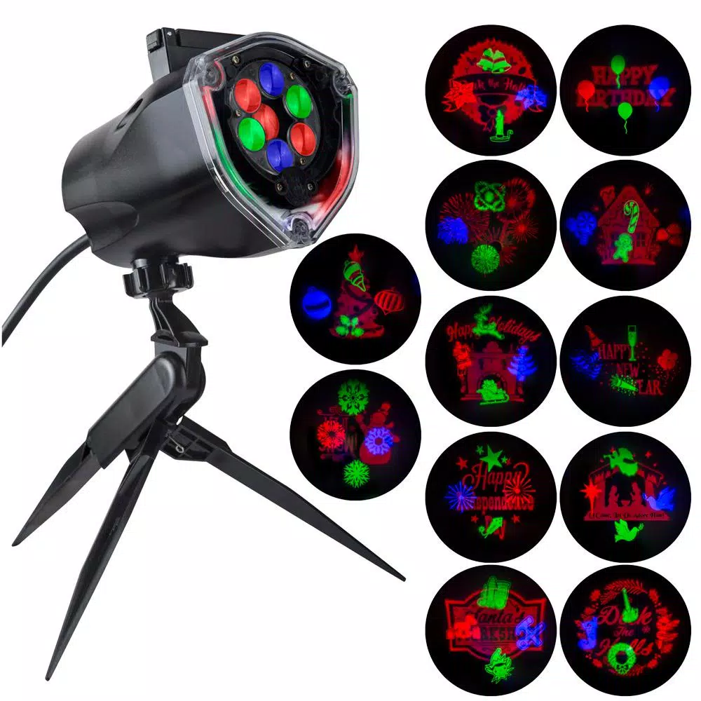 Quickly and easily add a holiday touch to your home décor with this holiday projector. Each projector includes slides for Christmas, July 4th, Birthday and New Years holidays. Perfect for interior or exterior walls and living spaces.