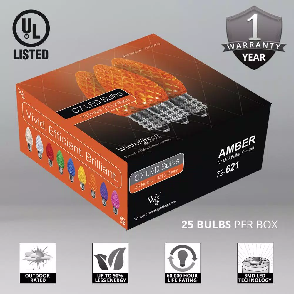 - Box of 25 C7 orange faceted OptiCore LED light bulbs, E12 (candelabra) base; fits any standard C7/E12 sized socket