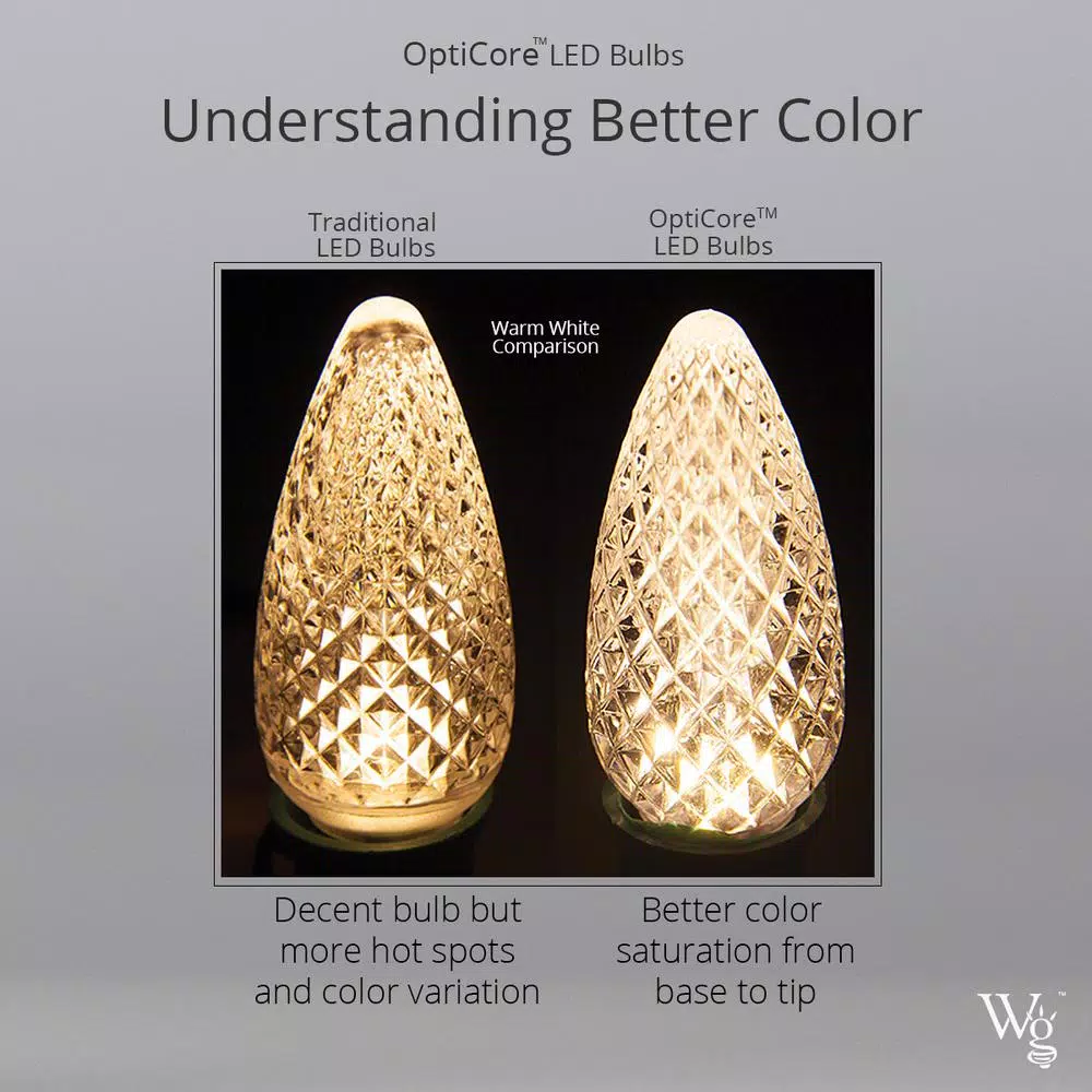 Say hello to the next generation of LED lights: OptiCore, superior bulbs that offer unsurpassed beauty, ruggedness and reliability, with all of the brightness and color saturation of vintage Christmas lights. The lens is made of polycarbonate, up to 200 times stronger than glass, making OptiCore bulbs virtually unbreakable. The lens is also 115% thicker than ordinary bulbs, allowing the light to infuse the lens with rich, vibrant color. Inside, the SMD LED diode produces brilliant light that saturates the lens evenly for a uniform appearance from every angle. And OptiCore bulbs will last for years; they boast an average bulb life of 60,000-hours. With OptiCores durability, energy efficiency and beauty, these may be the last C7 replacement bulbs you ever need.