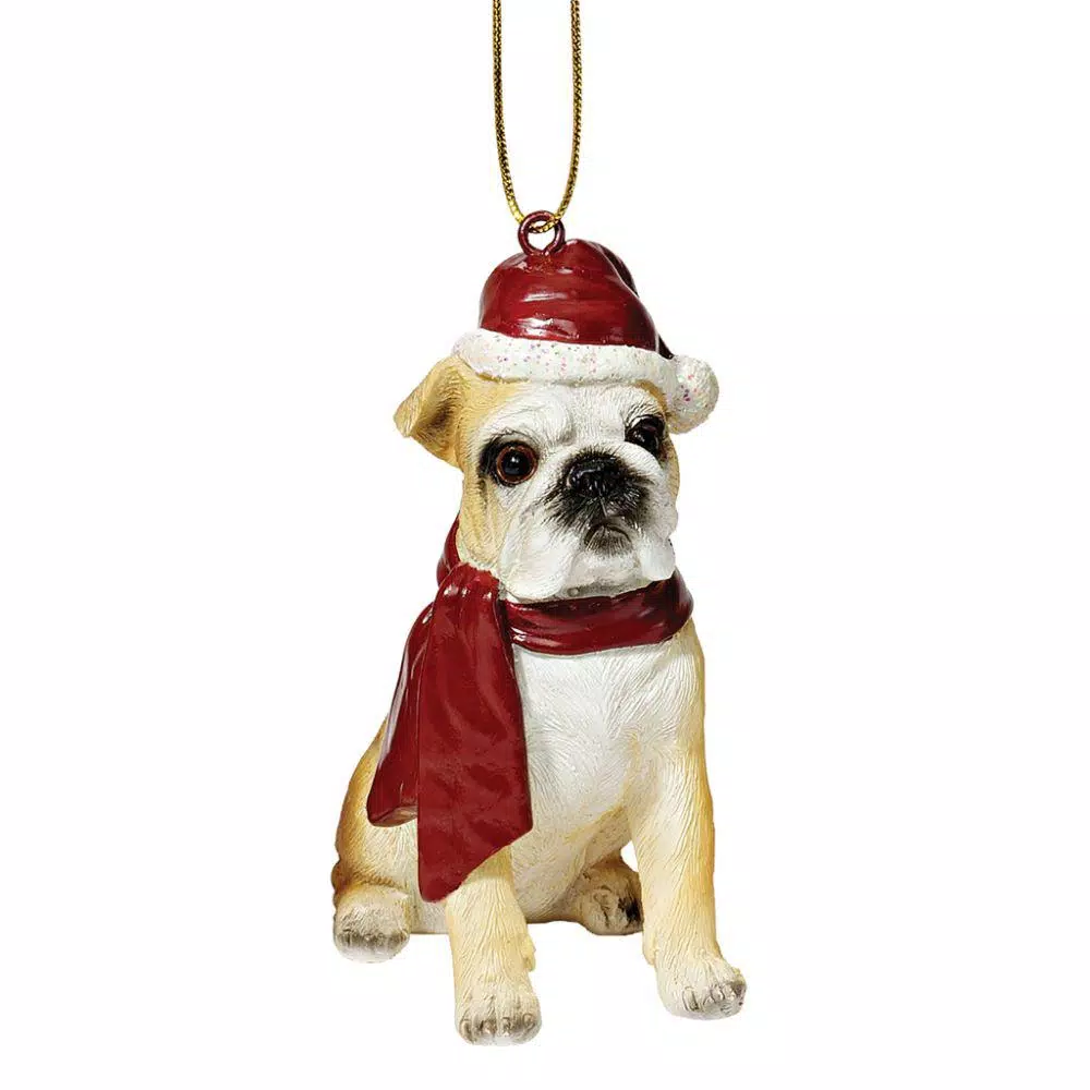 With a festive Santa hat and red scarf, this adorable Bulldog dog ornament has neither a bark nor a bite worth worrying over. Our Design Toscano exclusive Bulldog dog ornament is realistically sculpted, cast in quality designer resin and hand painted for the discriminating dog lover. The perfect canine gift for Bulldog dog aficionados and a fun way to include your pets in holiday decorating. approximately 2-1/2 in. W x 1-1/2 in. D x 3-1/2 in. H, 1/2 lbs. More dog breed ornaments available: French Bulldog, Weimaraner, Beagle, Dalmatian, Chihuahua, Dachshund, Yorkie Yorkshire Terrier, Pointer, Border Collie, Mini Schnauzer, Cavalier King Charles Spaniel, German Shepherd, Boston Terrier, Boxer, Bulldog, Golden Retriever, Siberian Husky, Black Labrador, Maltese, Pit Bull, White Poodle, Pug, Rottweiler, Doberman, Welsh Corgi.