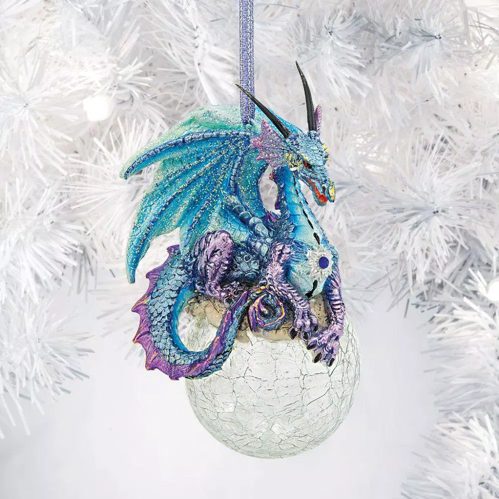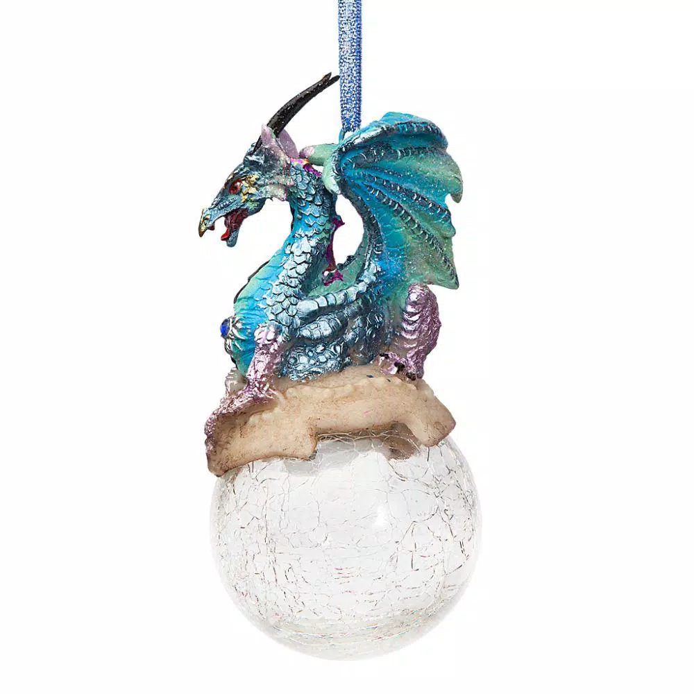 From a mystical land of ice and snow, our limited edition holiday dragon ornament floats in on her very own crackle glass orb. Artist Liam Manchester has expertly cast this collectible in quality designer resin, hand-painted it in metallic icy hues with glitter-kissed wings, and added a matching ribbon hanger. Designed exclusively for Design Toscano, our holiday Dragon ornament makes a one-of-a-kind tree decoration and a most creative addition to your gothic dragon collection. 3-1/2 in. W x 3 in. D x 5 in. H, 1 lb.