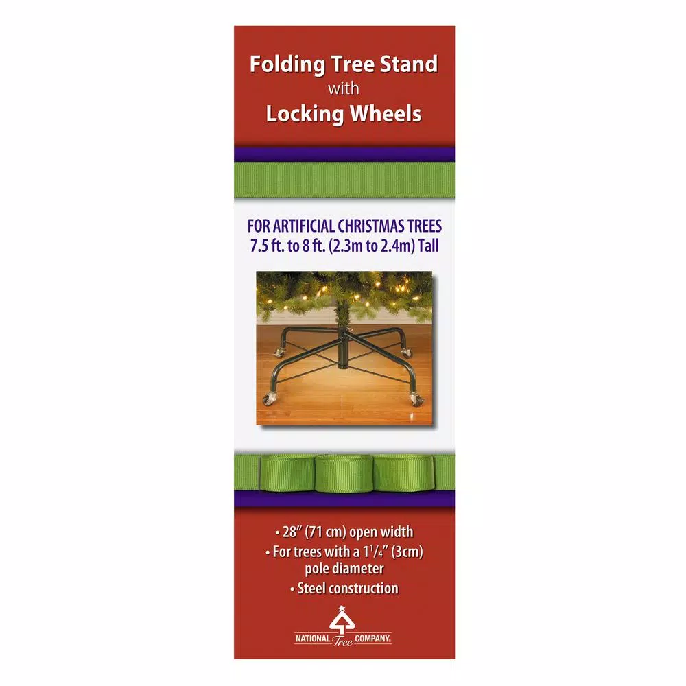 This revolving metal tree stand provides a convenient way to easily move your tree. It is for use with 7.5 ft. to 8 ft. tall artificial trees with 1.25 in. Dia center poles. This stand features sturdy steel construction and folds flat for convenient storage. All 4 wheels include locks to secure from unwanted rolling.