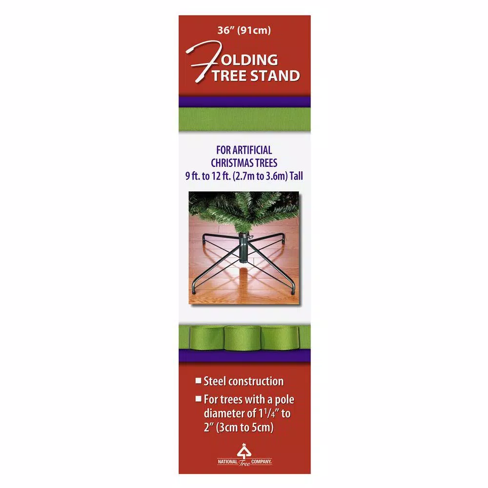This folding metal tree stand is for use with 9 ft. to 12 ft. tall artificial trees with a 2 in. Dia center pole. This stand features sturdy steel construction and folds flat for convenient storage. Includes thumb screw for securing stand to tree pole.