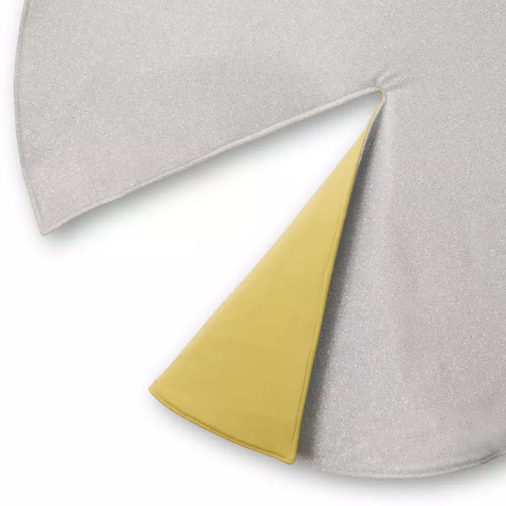This attractive and durable tree skirt is constructed of polyester fabric with a soft cotton fill. It is handcrafted and features a plush feel and finish. Reversible design of silver glitter/gold solid.