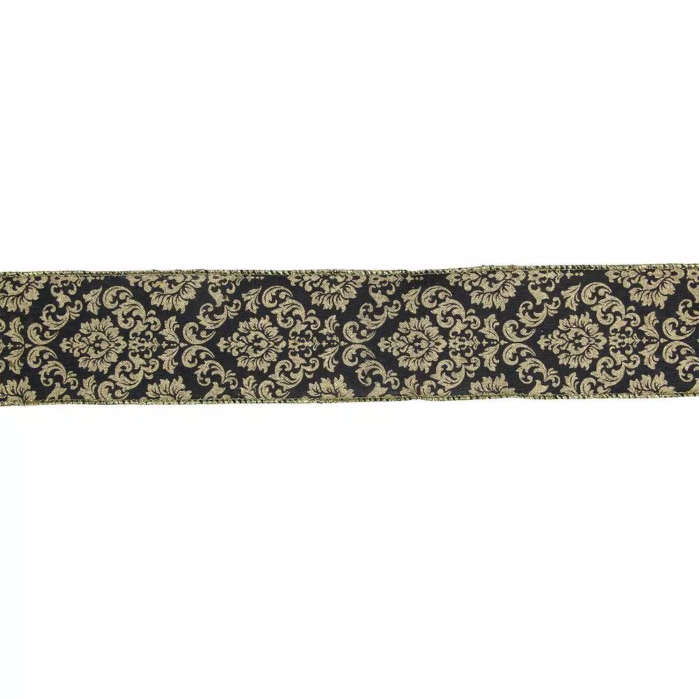 This damask black and gold ribbon is a great addition when you’re decorating your gifts and home for the holiday season. This wired ribbon will help everyday designs maintain their shape and beauty. Whether you’re a florist an event planner or crafter wired edge ribbon is a dream to work with. Add this ribbon to your Christmas tree mantle or stairway to add beauty and shine to your home for the holidays. Features: Damask pattern ribbon. The ribbon is black and gold. Features a metallic gold trim. Embellished with thick glitter. Sewn wire edged ribbon allows you to bend and shape your creations to decorate with ease. Ribbon comes on 1 spool. Perfect for holiday decor. Dimensions of each spool: 2.5 in. W in. x 16 yds. in length. Material(s): polyester/nylon.