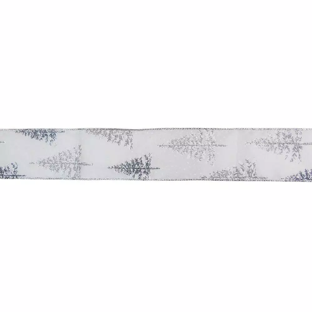 This gorgeous white ribbon with shiny sparkling silver trees would be a great way to decorate your gifts and home for the holiday season. The wired ribbon will help everyday designs maintain their shape and beauty. Whether you’re a florist an event planner or crafter wired edge ribbon is a dream to work with. Add this ribbon to Christmas gifts wreaths or trees for beauty and shine. Features: Design features shimmering silver glittery trees. Sewn wire edged ribbon allows you to bend and shape your creations to decorate with ease. Ribbon has a shiny metallic silver trim. Ribbon comes on (1) spools. Dimensions of each spool: 2.5 in. W x 16 yds. in length. Material(s): polyester.