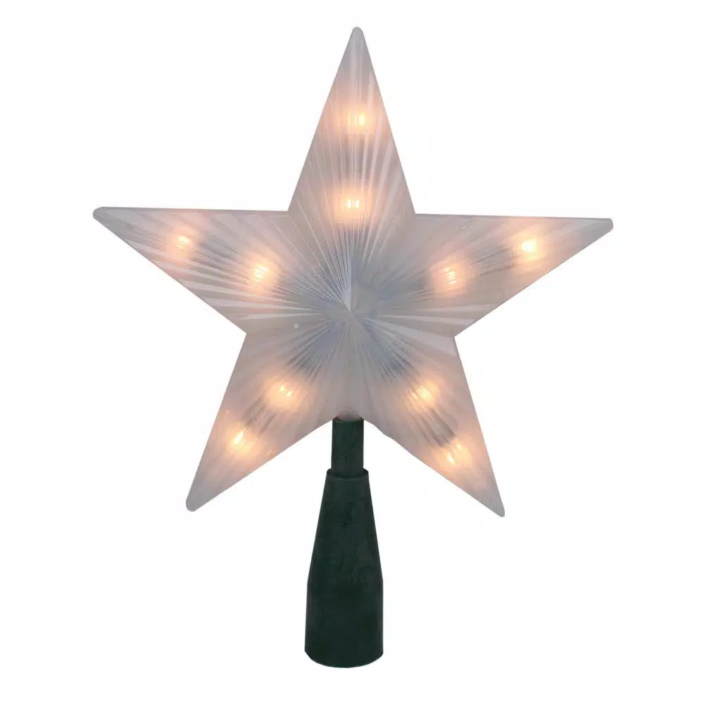 Crown your Christmas tree with this traditional frosted 5-point star tree topper. Features a decorative starburst design. This tree topper will be the perfect finishing touch to your holiday decor. Product Features: Color: clear bulbs / white wire. Number of bulbs: 10. Bulb size: mini. 30 in. green lead cord. Double-sided design. Additional Product Features: Steady burning. UL certified and approved for indoor use only. If 1 bulb burns out the rest will stay lit. Contains 1 plug with end connector which allows you to stack multiple sets of lights together (not to exceed 210-Watt). Comes with replacement bulbs spare fuse and cone to attach to tree. Wire gauge: 22. Dimensions: 7 in. H x 7 in. W x 2 in. D Material(s): plastic/glass bulbs/wire.