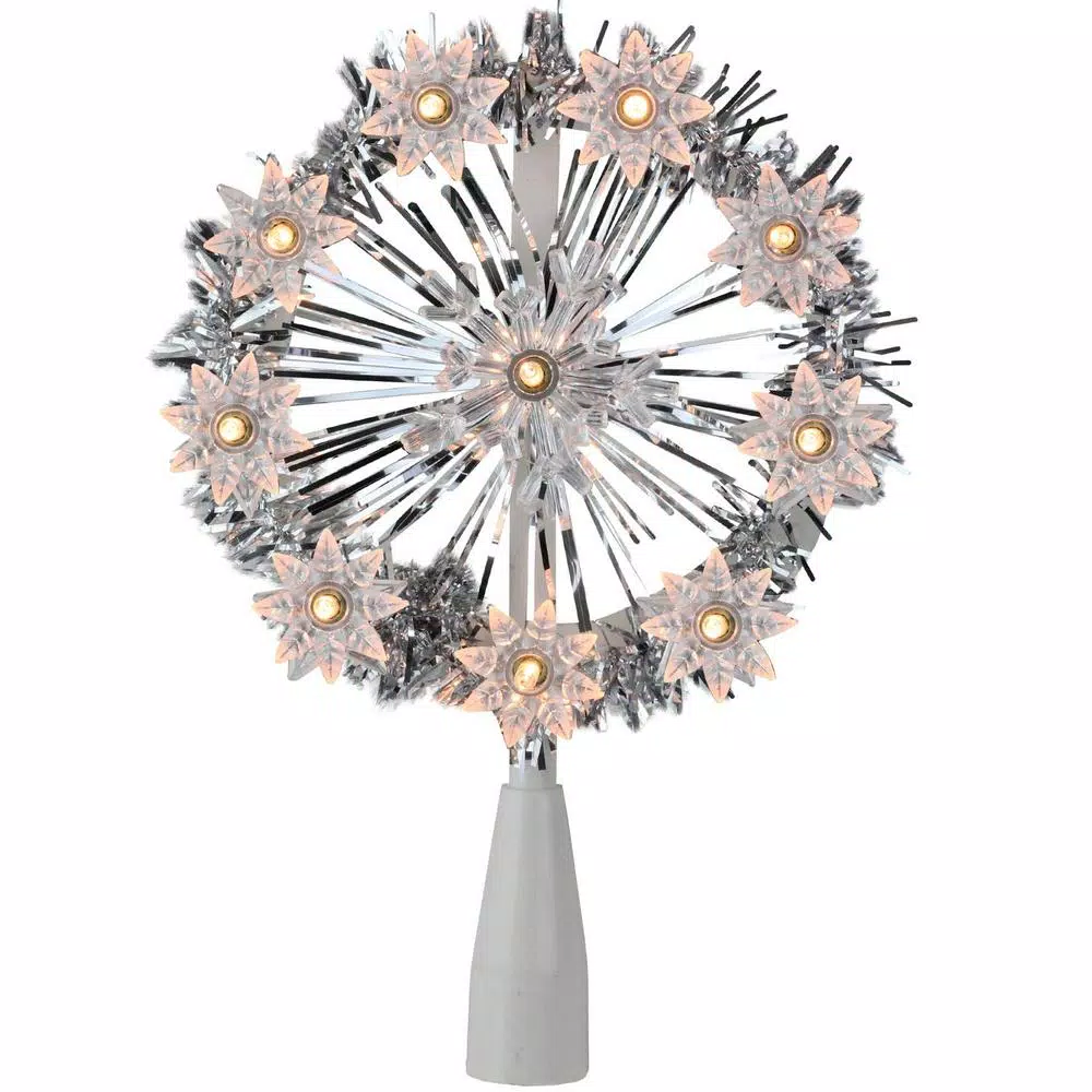 Add a modern touch to the crown of your Christmas tree with this unique topper. It features a silver tinsel wreath with flower lights, and a snowflake center with a silver tinsel starburst. The mini lights are clear with a white wire.