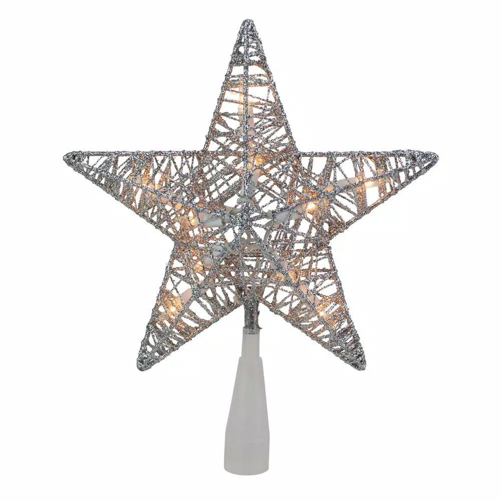 This elegant tree topper adds sparkly light to your Christmas tree. Glittery star encases clear mini lights giving the star a warm glow. The perfect finishing touch for your Christmas tree. Product Features: Color: clear bulbs / white wire. Number of bulbs: 10. Bulb size: mini. 24 in. white lead cord. Single-sided design. Additional Product Features: UL certified and approved for indoor use only. If one bulb burns out the rest will stay lit. Comes with replacement bulbs spare fuses and cone to attach to tree. Contains 1 plug with end connector which allows you to stack multiple lighted items together (not to exceed 210-Watt). Wire gauge: 22. Dimensions: 9.5 in. H x 8.75 in. W x 1.25 in. D Material(s): metal/plastic/wire.