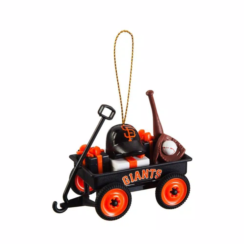 Reminiscent of the vintage Radio Flyer wagon, this San Francisco Giants whimsical Christmas ornament carries a couple of gift boxes, the team helmet and ball. Perfect for any sports fan. Makes a great gift. Classic design will delight fans young and old alike.
