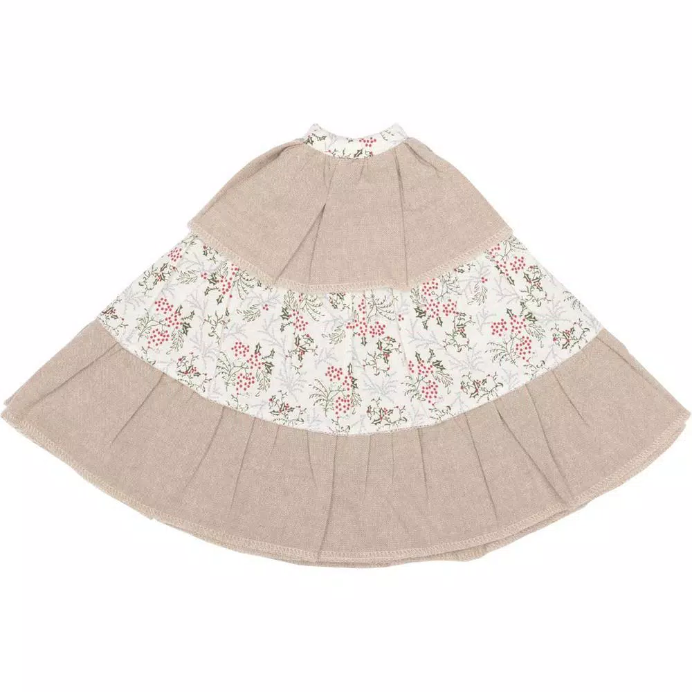 - Alternating khaki chambray and winter floral print ruffled layers