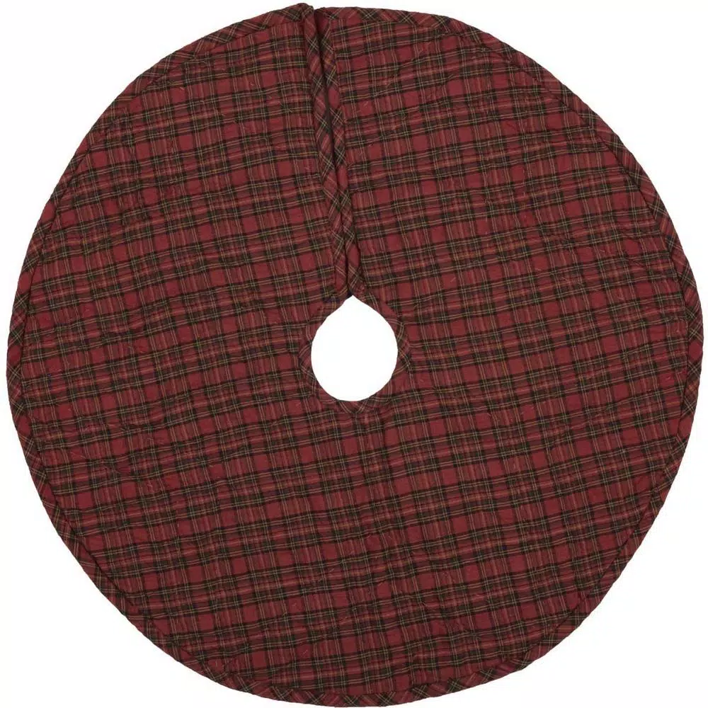The festively primitive Tea Star Mini Tree Skirt features an enlarged 6-point star in the center in various brick red, moss green, and black plaid fabrics. The opening and outside edge trimmed with 0.5 in. tartan plaid binding. Brick red, forest green, and gold tartan plaid on its back allows for reversibility.