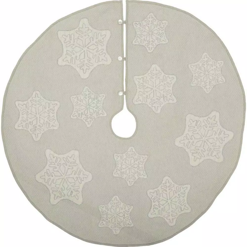 Ingrid is a White Christmas design a textured holiday look. The Ingrid Tree Skirt 48 in. brings a touch of the north to your home with an ash grey woven cotton, appliqued snowflakes in antique white tobacco cloth with silver lurex for a holiday glimmer. Includes 3 pearl button closures. Reverses to heather grey cotton.