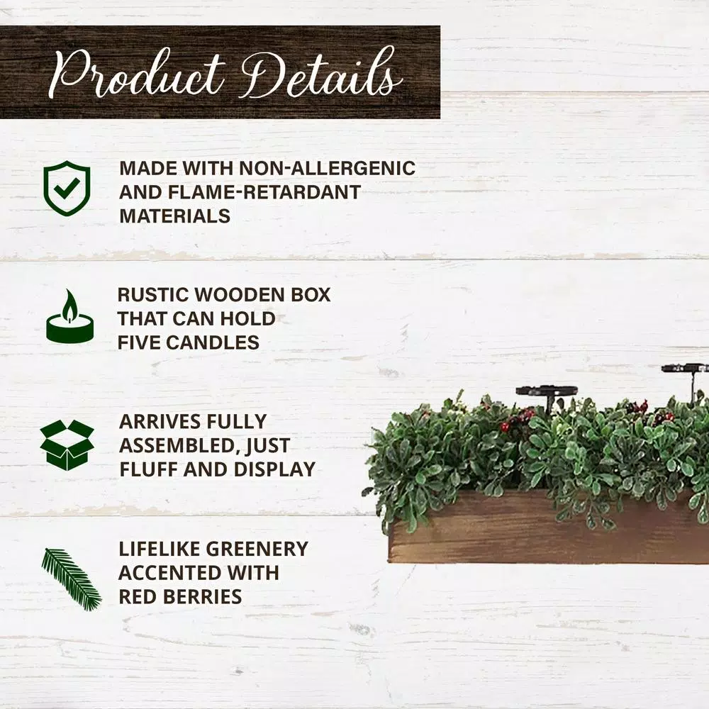 Spruce up your holiday decor with this 5-candle holder centerpiece from Fraser Hill Farm. A rustic wooden box provides the perfect base for the beautiful arrangement, featuring boxwood greenery and red berries. 5 platforms are raised above the wintery display so you can add your favorite shape and scent of candles and change them out as you please. The centerpiece is decked out with realistic-yet-artificial foliage and accented with red berries. With this candle holder at the center of your festive gatherings, you’ll have seasons upon seasons of holiday cheer.