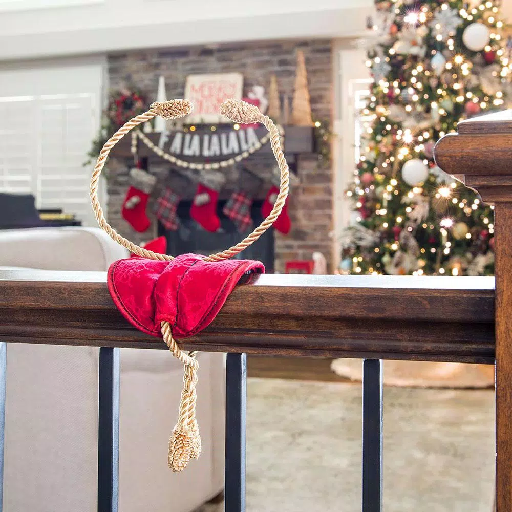 Hanging Christmas garlands from your banister is a quick and festive way to spruce up your home during the holidays, but getting scratches in your wood or metal banister either from the garland or the wire ties used is a deal breaker for most. These patented banister garland ties protect your banister railing from dings, dents and scratches caused by hanging garlands. The easy-to-attach banister ties secure directly to the banister as well as directly to the garland with padding in between the banister and garland twist ties. Padded for extra protection and lined with a rubber backing to preventing the pad from slipping around. The classic Christmas look to complement your wreath is complete with gold twist ties and red fabric that is embossed with a snowflake pattern. Comes in packs of 3.