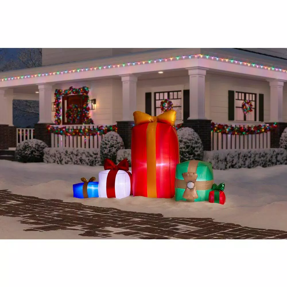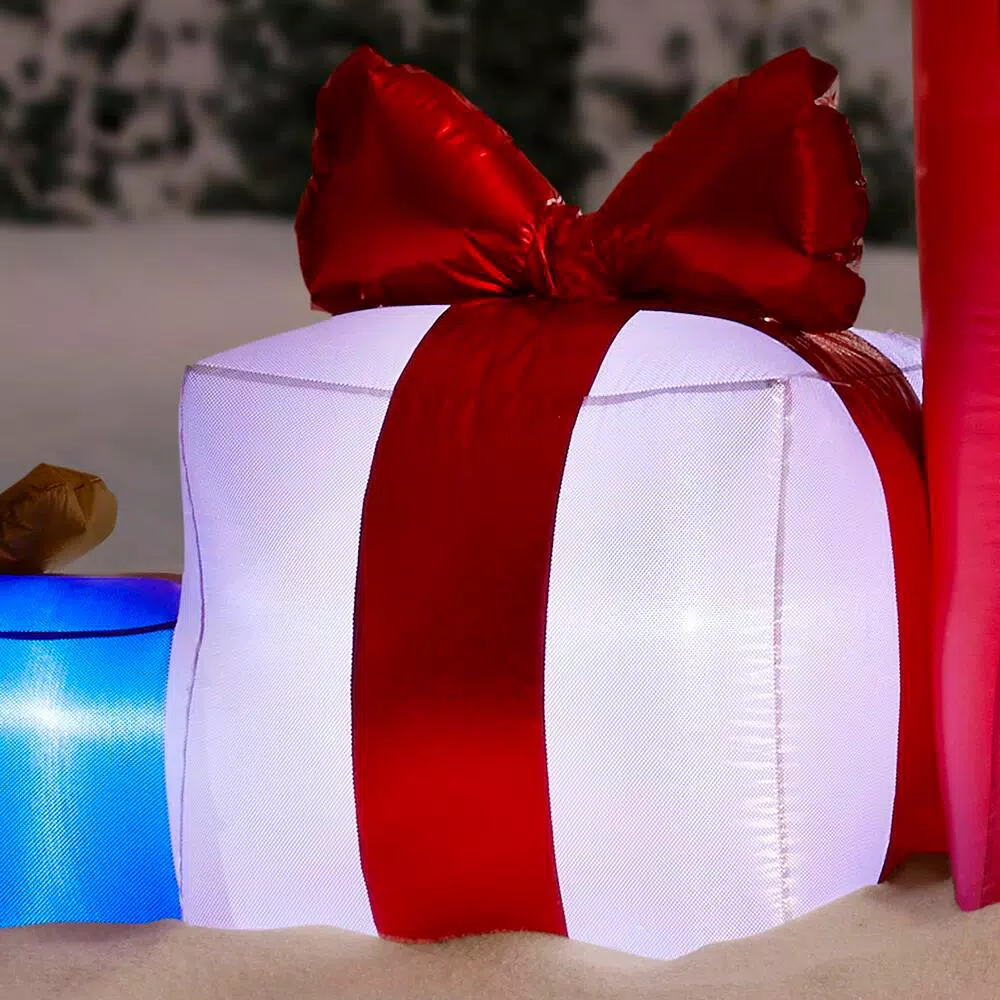Deck the yard with an Airblown Inflatable Set of Gifts. Featuring beautiful metallic fabrics, this stunning Christmas inflatable makes an eye-catching addition to your outdoor Christmas decorations. Setup is super simple. Just plug it in, stake it down and watch the magic unfold. Includes everything needed for easy outdoor setup.