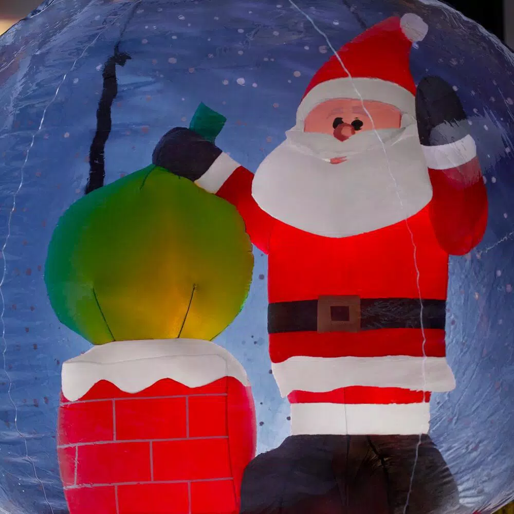 Bring happiness to passersby with this Airblown Inflatable Snow Globe. Santa stands ready on a rooftop as Snow Flurry Projection Lighting swirls all around him. The base reads “Happy Holidays” to bring a smile to everyone’s face. Use it as a standalone piece or group it with other inflatables for a supersized scene. Setup is easy – just plug it in, stake it down and enjoy the fun. Includes everything needed for outdoor setup.