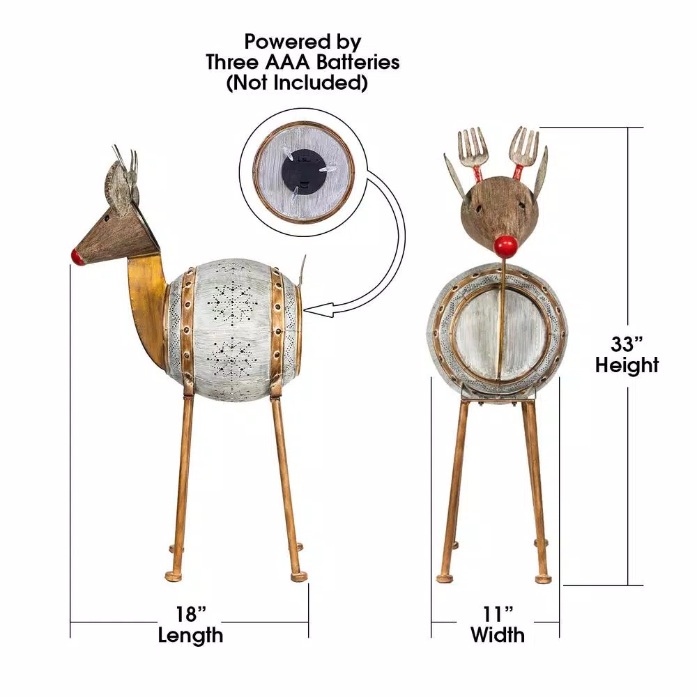 Transform your lawn into a winter wonderland with Alpine Corporation’s 33 in. Tall Metal Barrel Reindeer. This stunning reindeer is the perfect addition to your holiday display. It’s constructed of high-quality metal and is built to withstand prolonged outdoor use, perfect for areas with extreme cold or heavy snow. It features 6 warm white LED lights and includes a timer to set for 6 hours on and 18 hours off. The glowing lights will provide a beautiful display throughout the winter evenings. It’s battery operated using 2 AA batteries (not included), allowing for placement anywhere across your yard. Set this festive reindeer up outside or indoors. The Alpine Metal Barreled Reindeer measures 18 in. x 11 in. x 33 in., perfect for your home.Alpine Corporation is one of America’s leading designers, importers, and distributors of superior quality home and garden decor products. Alpine Corporation’s award winning in-house design team continuously develops new and innovative “statement pieces” for your home and garden. Your outdoor living spaces will be the envy of the neighborhood with our wide assortment of fresh, fashionable and contemporary products, from beautifully crafted solar garden stakes featuring patented motion and fiber optic lighting technology to gorgeous glass and glow-in-the-dark bird baths and feeders.