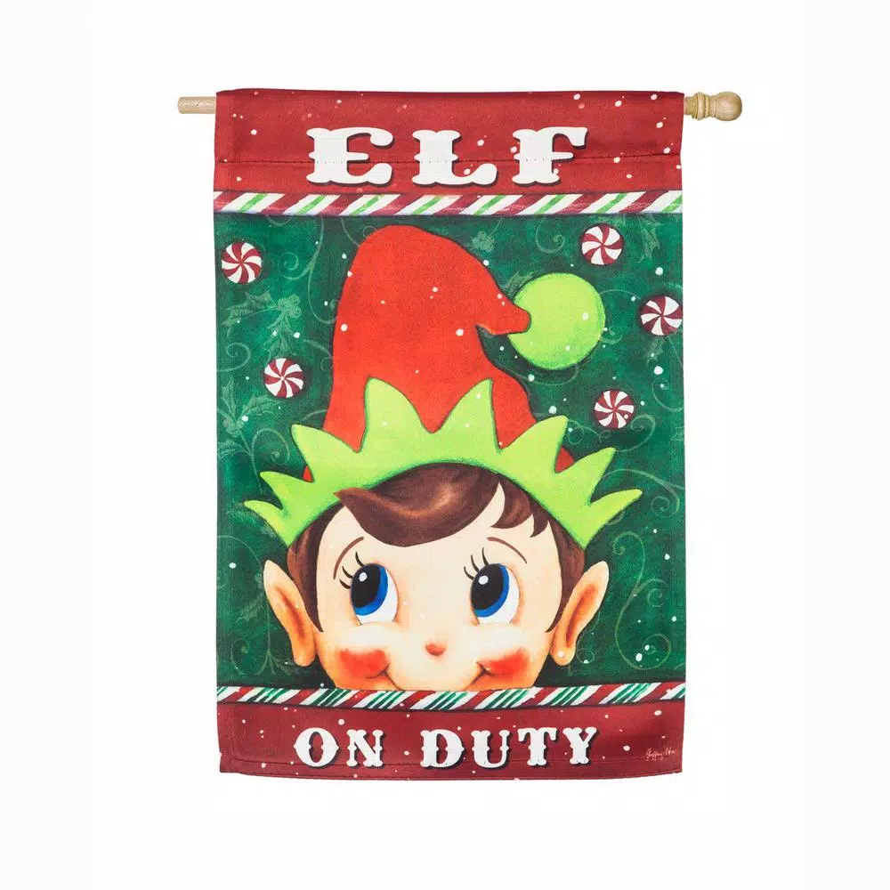 Provide an ideal addition to your festive decor with the selection of this Evergreen Elf on Duty House Suede Flag. Features a double-sided design.