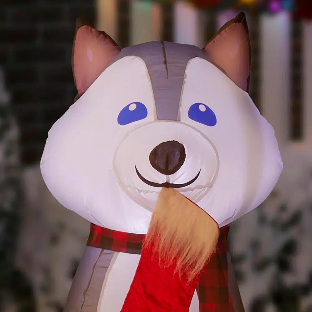 Bring holiday happiness to passersby with this Airblown Inflatable Puppy Scene. Featuring four pups each holding a stocking with plush, fuzzy fabric, this adorable decoration is perfect for sharing Christmas cheer. Use it as a standalone piece or group it with other inflatables for a supersized scene. Setup is easy – just plug it in, stake it down and enjoy the fun. Includes everything needed for outdoor setup.