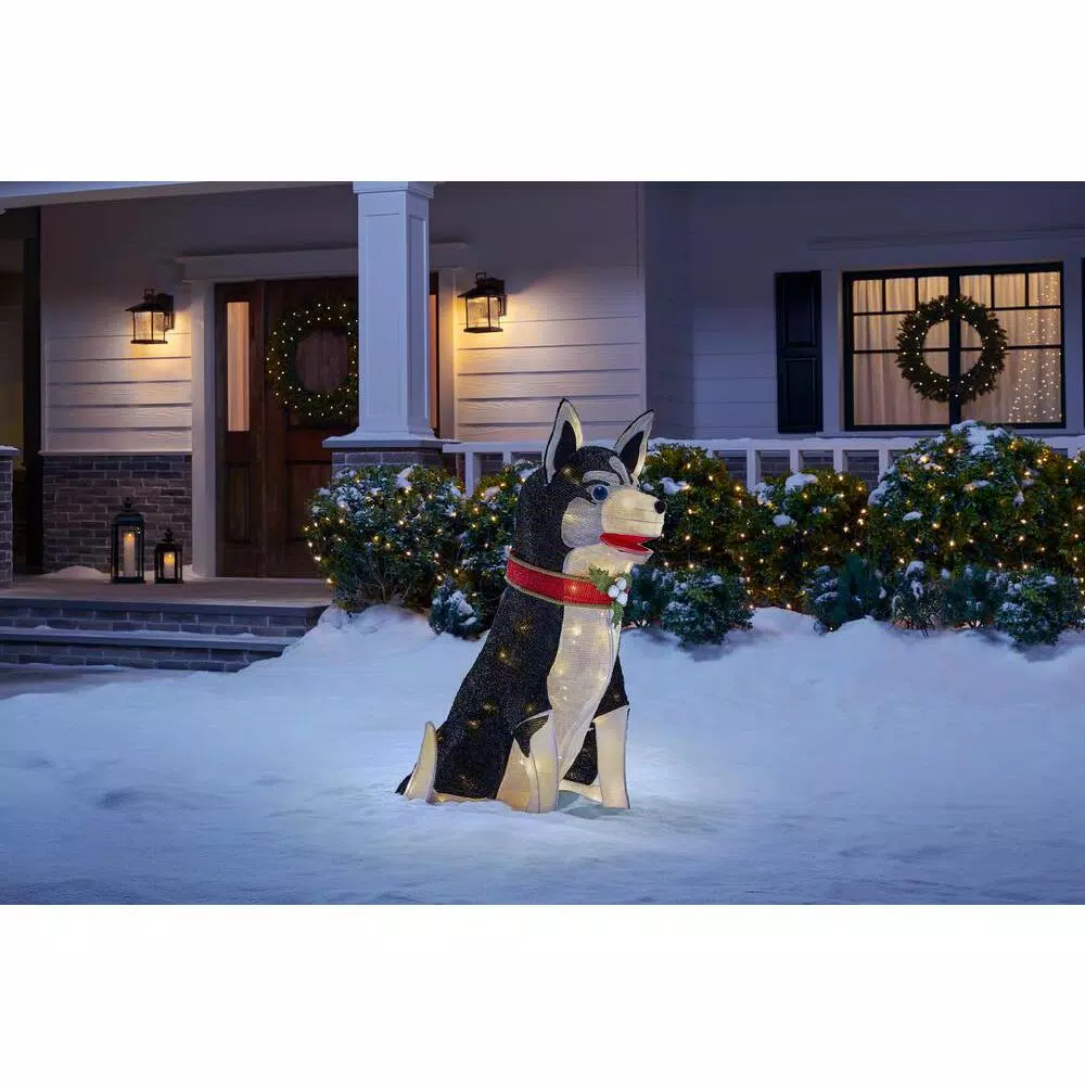 This head-turning yard sculpture will be the star of your holiday display. Featuring 80 stunning LED lights, this 36-in. tinsel husky decoration is made with a durable metal frame with weather-resistant fabric. Use it for indoor or outdoor spaces. The long-lasting bulbs remain cool to the touch and will shine through the season. The sculpture is easy to set up, and it includes ground stakes.